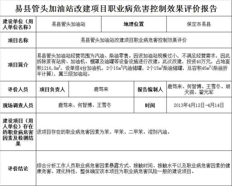 易县管头加油站改建项目职业病危害控制效果评价