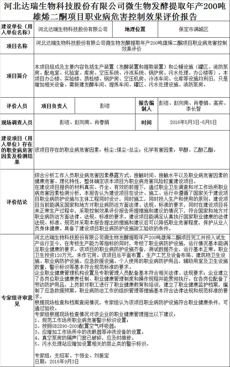 河北达瑞生物科技股份有限公司微生物发酵提取年产200吨雄烯二酮建设项目职业病危害控制效果评价